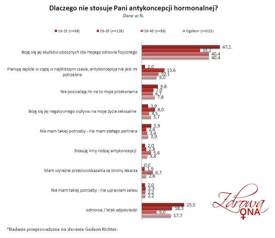 Artykuł w kategorii: Grono ekspertów Alergologia Diabetologia Dla mediów Endokrynologia Ginekologia Hematologia Kardiologia Materiały dodatkowe Neurologia Pediatria Psychiatria Reumatologia Urologia Data publikacji: 2013-03-19 Obawy przy stosowaniu antykoncepcji hormonalnej Najważniejszą przyczyną, dla której kobiety nie stosują antykoncepcji hormonalnej jest obawa przed pojawieniem się skutków ubocznych dla zdrowia (40% ogółu odpowiedzi). Pobierz wykres