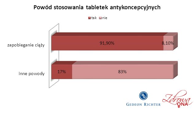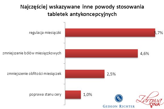 • Spośród innych najczęściej wymienianych powodów wymieniano wpływ na uregulowanie cyklu miesięcznego (5,7% ogółu uczestniczek) oraz wpływ na zmniejszenie bólów miesiączkowych (4,6% ogółu pacjentek). W następnej kolejności wskazywano zmniejszenie obfitości krwawienia miesięcznego (2,5%) oraz poprawę stanu cery wywołaną stosowaniem tabletek antykoncepcyjnych (1% pacjentek).