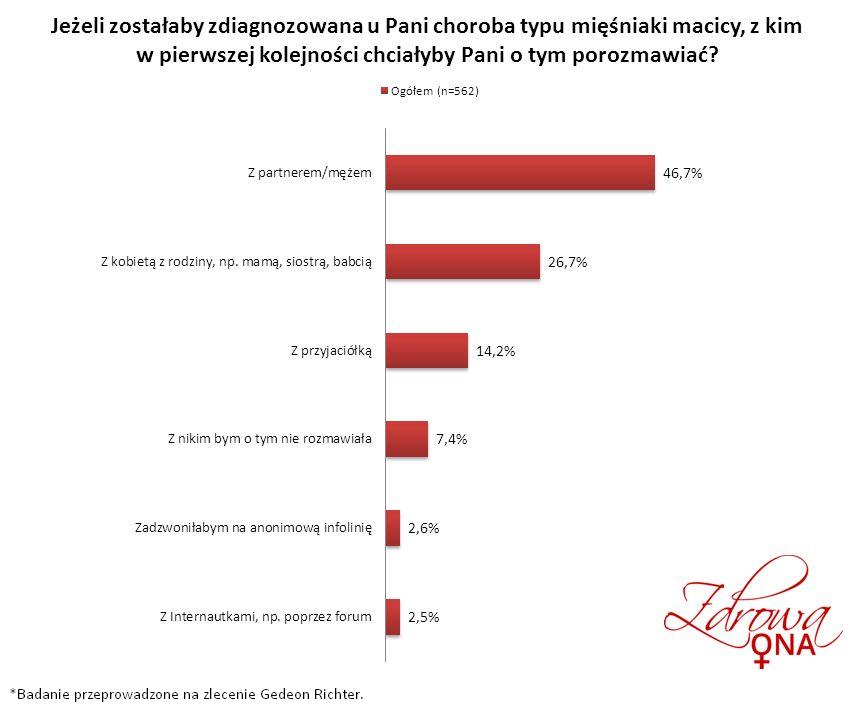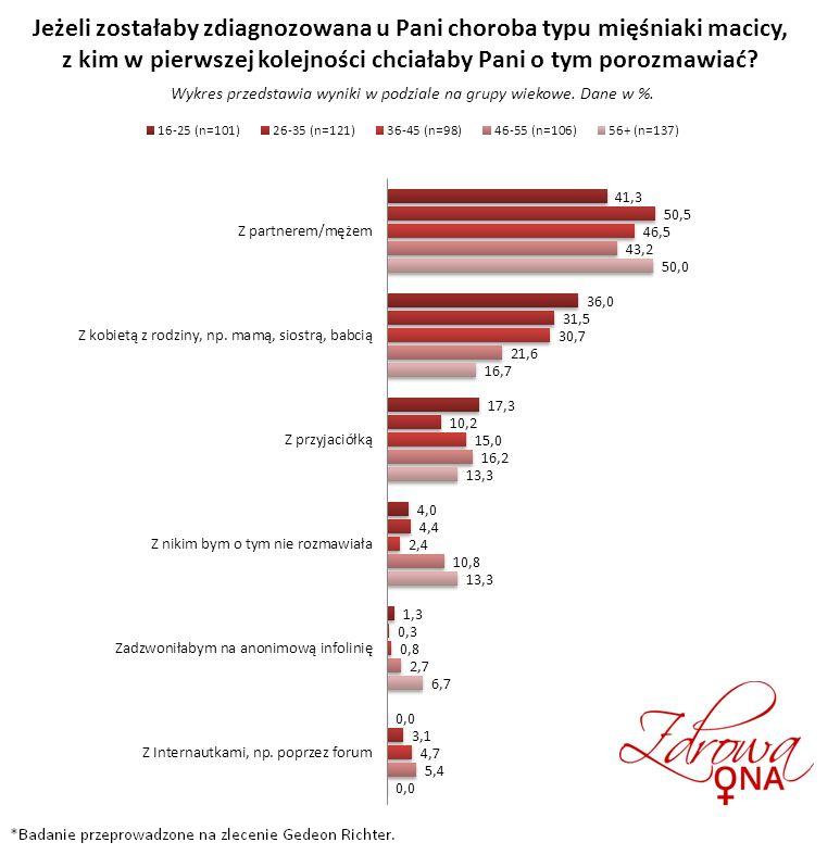 - W przypadku diagnozy mięśniaków macicy, niezależnie od wieku w pierwszej kolejności niemal 47% badanych kobiet porozmawiałoby ze swoim partnerem lub mężem. Drugim kontaktem byłaby inna kobieta z rodziny (26%), przy czym częstość ta maleje z wiekiem.