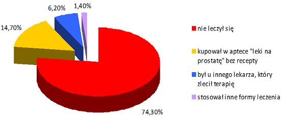 Prawie 3/4 mężczyzn (74,30%) przyznało, że nie leczyło swoich dolegliwości urologicznych w czasie, gdy nie zgłaszali się przez kilka/kilkanaście miesięcy do lekarza urologa. Tylko 14,7% badanych w tym okresie podjęło próbę leczenia preparatami OTC (leki bez recepty) redukującymi objawy LUTS.
