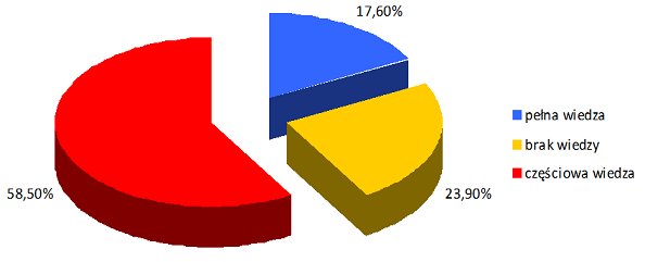 Wiedzę 17,60% pacjentów określono, jako pełną, natomiast 58,50% pacjentów posiada wiedzę częściową.
